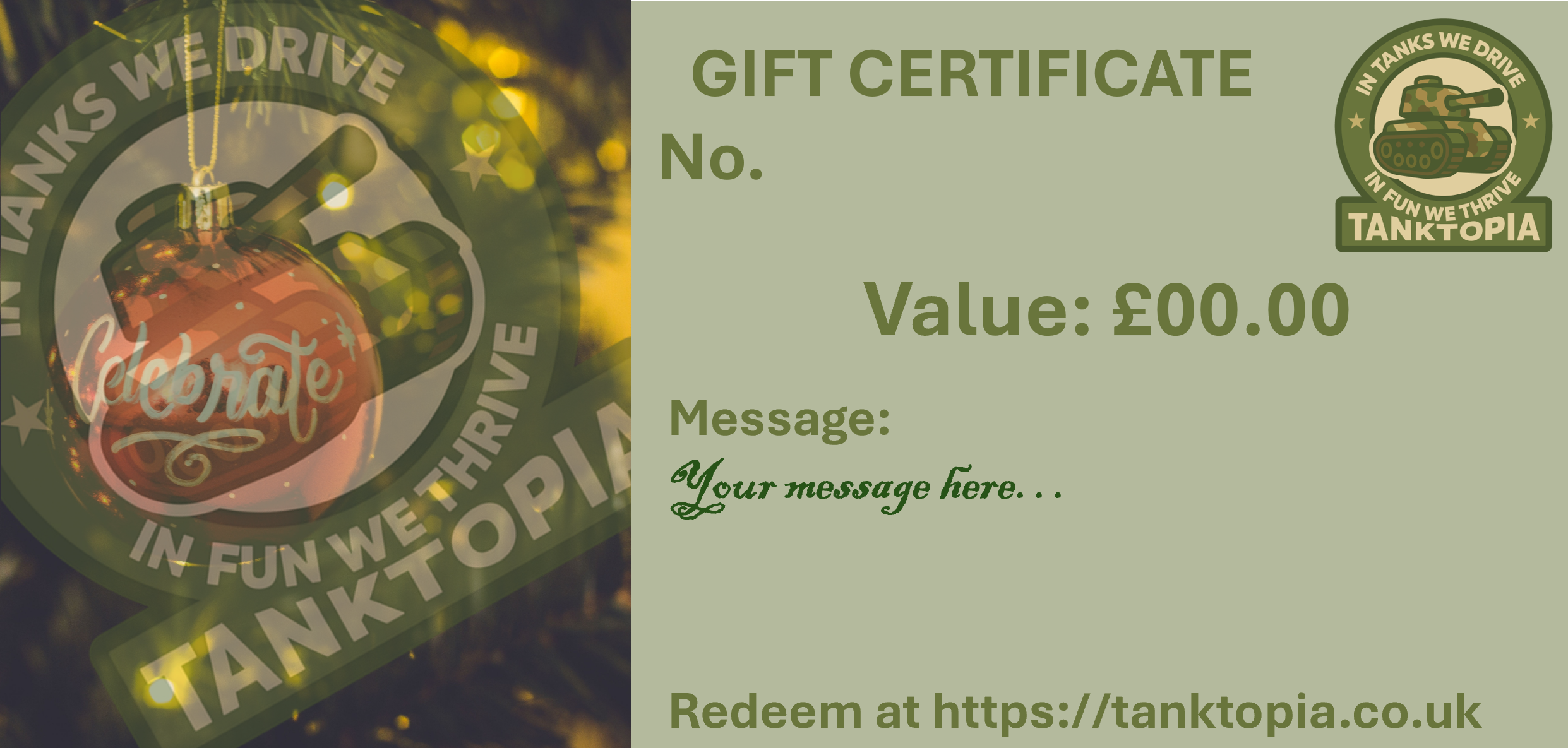 If you want a physical Gift Certificate to give your Tank loving loved one, friend or family member then you can purchase from a choice of designs.