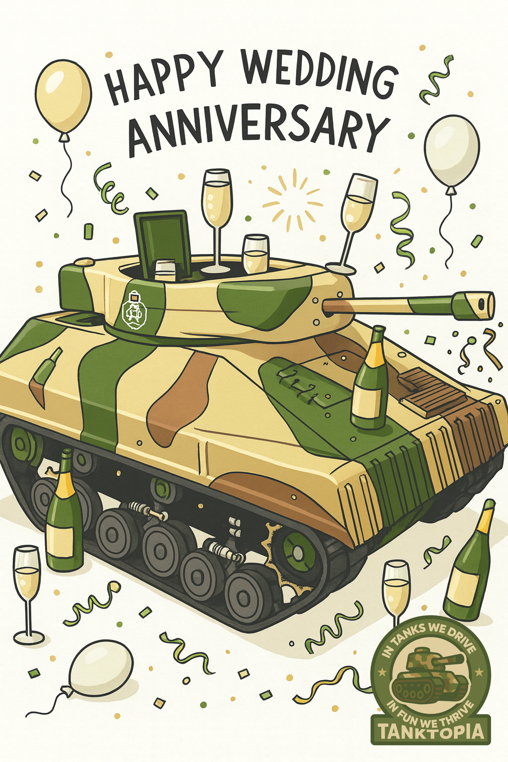 Tanktopia exclusive ‘Happy Wedding Anniversary’ greetings card, featuring a Tanktopia Mini Tank with Champagne Bottles and Glasses with balloons, confetti and streamers.
